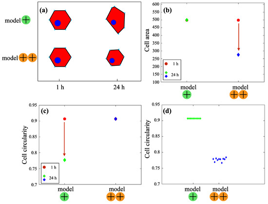 Experimentally observed cell shape changes in this case can be reproduced by keeping the initial value of , i.e., 20 and increasing only the value . By increasing the value of , our simulations show that the circularity remains at the initial value of 0.9, but the cell area reduces to in the final state, similar to experiments (Figure 6b,c). This suggests that in the case of highly positively charged substrates, cell cortical tension dominates cell–substrate adhesion and tends to shrink the cells but keep the overall initial circularity.