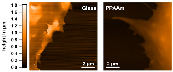 First, 4000 MG-63 cells/cm2 were cultured on pristine glass cover slides (Thermo Fisher Scientific, Waltham, MA, USA) as well as plasma polymer (PPAAm)-coated cover slides for 1 and 3 h. After fixation with 4% PFA, cells were washed thrice with PBS before measuring their nanomorphology in PBS with a Scanning Ion Conductance Microscope (SICM) (NX-bio, Park Systems, Korea) [47]. The measurements were performed with borosilicate glass nanopipettes exhibiting opening diameters below 80 nm. They were pulled from capillary tubes (inner diameter 0.58 mm) using a CO2 laser puller (Sutter P-2000, Sutter Instrument, Novato, CA, USA) with the following parameters: Heat: 260, Filament: 4, Velocity: 50, Delay: 225, Pull: 140. Topography images were acquired in approach–retract–scheme mode (ARS mode), which is often referred to as dynamic or hopping mode. The ion current setpoint was 98% of the base current (i.e., current far away from the sample, corresponding to ca. 1 nA). For each cell (n = 6 cells per surface after 1 h, n = 18 cells per surface after 3 h), 3 topography images (10 × 10 µm2, 128 × 128 pixels) at randomly chosen spots at the cell edges were taken. Cell edge heights were exemplarily measured with the open-source software Gwyddion (gwyddion.net, accessed on 17.03.2021) at 5 representative locations for each topography image.
