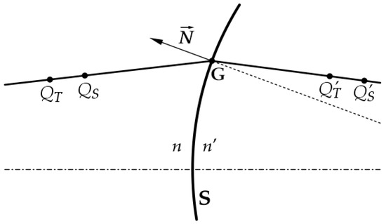 The first part of the analysis follows the standard procedure to locate tangential and sagittal foci of an ophthalmic lens. Though the reader may find this computation elsewhere [3,6], we have opted to reproduce the standard development here for completeness and to make clearer the different approximations we later use. First, we consider the refraction of a thin astigmatic pencil whose principal ray lays in a meridional plane of a surface with revolution symmetry (that is, the symmetry axis and the main ray are co-planar). Let and be the refractive indexes at either side of the surface, as depicted in Figure 1. The tangential and sagittal object points are located at points and . After the principal ray is refracted at point G, the tangential image for is , and the sagittal image point for is . The vector N is the normal to the surface S at point G.
