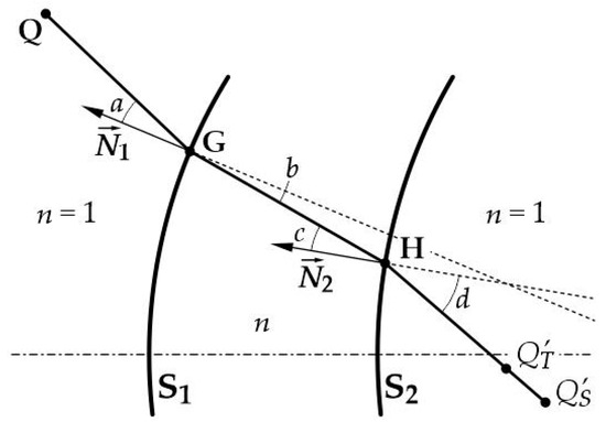Let us now consider a lens of refractive index surrounded by air, as shown in Figure 2. Let the object point be located at Q, so . Consider a thin ray pencil, which hits point G on the front surface, . The incidence and refracting angles of its principal ray are called a and b, respectively. The ray pencil propagates inside the lens up to a point H on the second surface, striking this surface with an incidence angle c and emerging with refraction angle d. In general, the emerging ray pencil is astigmatic, being and .