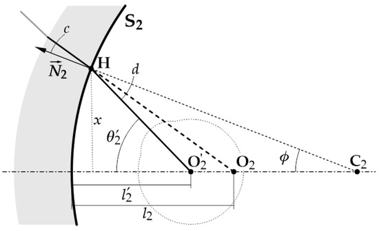 The angle d can be determined by the position of the lens relative to the eye, as shown in Figure 3. As it is usually done in ophthalmic lens design, we are assuming that the eye is looking through point H and that its visual axis coincides with the refracted principal ray. This also means the rotation center of the eye is located at , where the output ray meets the lens optical axis. We also use the classical assumption that the aperture stop and the exit pupil are located at the rotation center of the eye. When the eye rotates an angle , its visual axis goes through point H, whose transverse or radial coordinate with respect to the optical axis is x. The distance from the vertex of the back surface to (also the rotation center of the eye) is , with a related vergence .