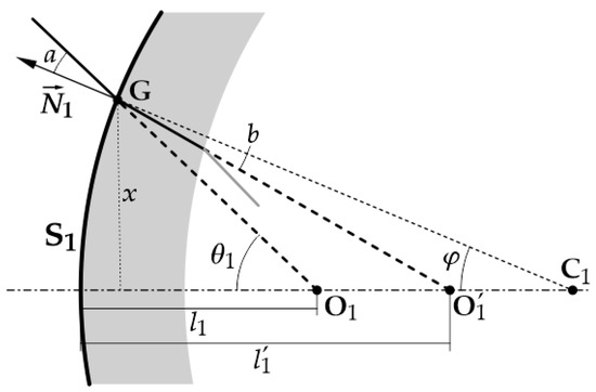 where , , , and . and are the main radii of curvature at G (sagittal and tangential, respectively). The angles a and b are the incidence and refraction angles of the principal ray at G.