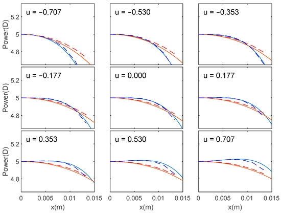 Tangential (blue line) and sagittal (red line) powers up to the term for a lens with D, D, , and D, for ranging from –0.707 to +0.707. The continuous line represents the analytical solution obtained within the approximation described in the text, while the dashed line corresponds to the exact numerical solution.