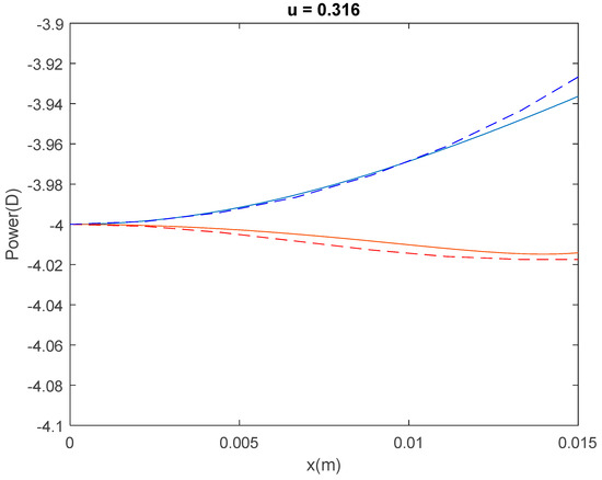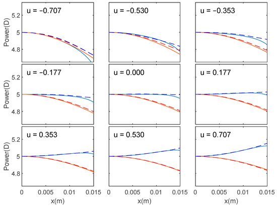 Tangential (red line) and sagittal (blue line) powers up to the term for a lens with D, D, , and D. The continuous lines represent the analytical solution obtained with the approximation described in the text for , while the dashed lines correspond to the oblique power of the lens computed by multiparametric minimization of the merit function (39) with weights .