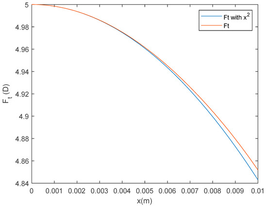 Tangential power for a lens with D, D, , and D, computed for . It was computed from Equation (18) using an eighth-order expansion for the back surface. The orange line is the tangential power computed with all the terms resulting from (18), while the blue curve has been computed only with the quadratic term.