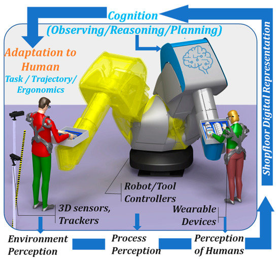 Transferring this notion to the case of HRC (Figure 1), a high payload collaborative robot would need to continuously assess the workflow execution status using information from equipment controllers, process sensors, and direct human input as well as data from wearable devices, which have been widely used in other sectors such as health care []. All data can be hosted in a Shopfloor Digital Representation (Digital Twin [,]) of the system and made available to all cognitive functions to achieve the following: