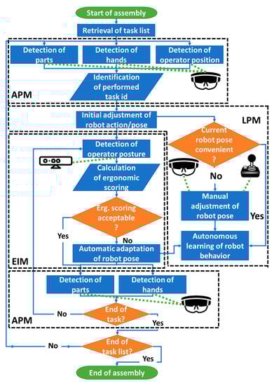The proposed method supports the seamless and non-intrusive collaboration of human and robotic resources. This is achieved through three distinct but interoperating modules: (i) action perception module (APM); (ii) ergonomics improvement module (EIM), (iii) learning and programming module (LPM). The workflow and the functionalities implemented by each are shown in Figure 2.