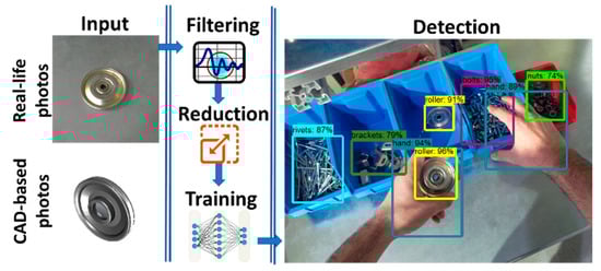 Augmentation of datasets using HSV filters and image reduction to 300 × 300 pixels were applied to increase the training and execution speeds. The NN trained with the synthetic data demonstrated increased accuracy when compared to the use of real-life photos (12% increase) or CAD photos (26% increase). The overall methodology is summarized in Figure 3.