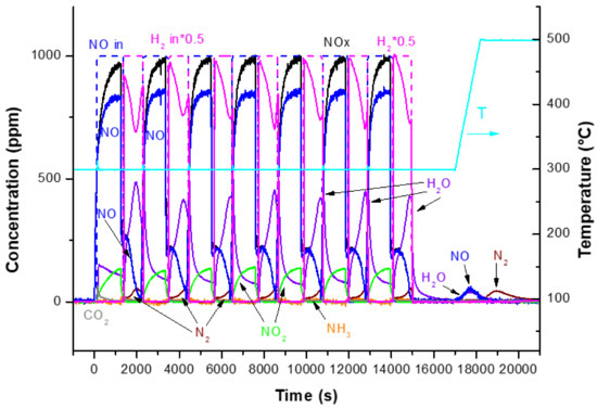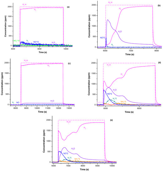 Lean/rich cycles at 150 °C and 300 °C are performed for the set of catalysts prepared (Figure 2a–d and Figure 3a–e, respectively) to ascertain the influence of catalyst formulation. The mentioned Figures report H2, H2O, NO, NO2, NH3, N2O, and N2 outlet concentrations, along with the H2 inlet profile (in dotted lines) of the rich phases corresponding to those cycles. The amounts of NOx stored in the previous lean phase for every catalyst and adsorption temperature are compiled in Table S1 as Supplementary Data.