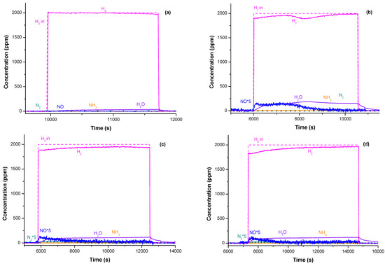 H2, N2, NH3, NO, NO2, and H2O outlet concentrations, and H2 inlet profile (in dotted lines) of the reduction step under 2000 ppm H2, at 150 °C, for the catalysts: (a) CZ; (b) Cu2/CZ; (c) Ba6/Cu2CZ; and (d) Ba11/Cu2CZ (Ba6/CZ not included due to very low catalytic response).