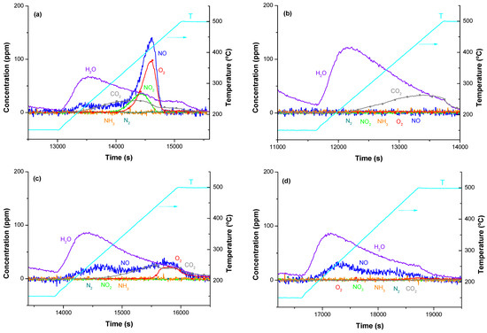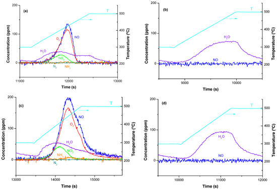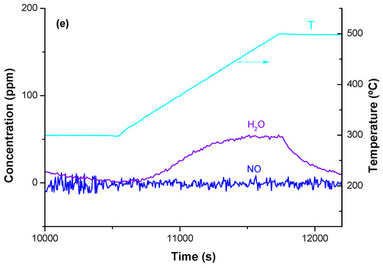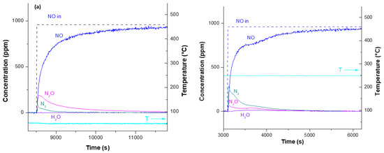 In order to check the complete removal of stored NOx from the surface after the reduction step, i.e., to verify the effectiveness of the H2 reduction under these experimental conditions, a thermal decomposition was performed, heating every catalyst up to 500 °C in inert atmosphere. The corresponding concentration profiles are reported in Figure 7a–d and Figure 8a–e, referring to results after adsorption-reduction cycles at 150 °C and 300 °C, respectively.