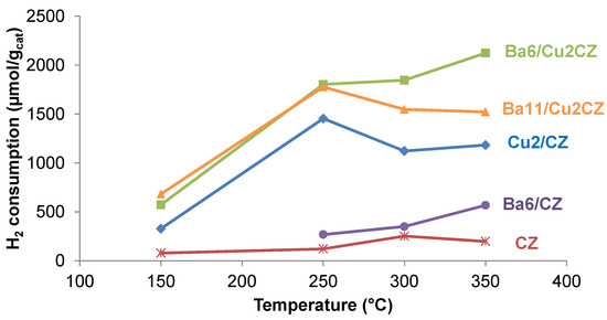 A detailed inspection of Figure 5 reveals that there is a relative maximum of H2 consumption at 250 °C in most of the samples. First of all, copper-containing samples achieve their maximum H2 consumption at approximately 250 °C (in agreement with the H2-TPR analyses), which should be accounted for in explaining the H2 consumption trends observed. Therefore, a very low H2 consumption is found at 150 °C; when the temperature is increased up to 250 °C or more, the catalysts are easily reduced. Cu-containing catalysts show different trends over 250 °C, which are directly related to the NOx adsorption capacity. Cu2/CZ shows a decrease in NOx adsorption capacity together with temperature (congruent, with a corresponding decrease in H2 consumption), while Ba/Cu-based catalysts present different trends when temperature goes up to 300 °C and 350 °C, respectively, with higher amounts of NOx stored in the previous step. Ba11/Cu2CZ shows a lower H2 consumption with respect to Ba6/Cu2CZ due to the slightly lower amount of Cu present when the Ba loading increases. On the other hand, copper-free samples show very low H2 uptakes, becoming slightly higher when the temperature increases, which might be ascribed to the marginally enhanced reducibility of ceria–zirconia upon temperature increase, and also to the different nitrite/nitrate population creation on the Ba6/CZ and CZ with temperature. In summary, a balance between the NOx adsorption capacity and the reduction extension, at whatever temperature, should be considered when analyzing H2 consumption amounts in terms of temperature.