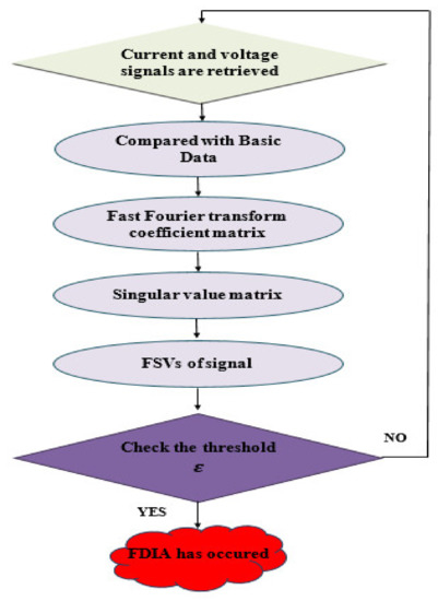 Firstly, the FFT approach reorders the input components into bit reversed sequence; after that, it makes the output transform with time decomposition. Accordingly, the main concept will be to separate the transform with length to 2 different transforms with length with applying an inherence. The FFT is broadly used for analyzing signals. Fourier assessments separate frequency details from the spectrum and make it better and easier for analyzing. In this regard, the SVD is used to obtain singular values of the components to compare with the threshold to detect the cyber-attack.