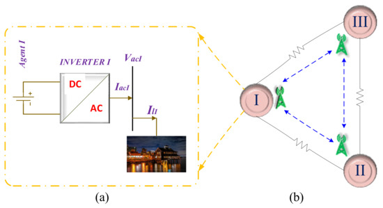 As can be seen, the independent AC-ISMG suggested in this study is depicted in Figure 2. DC resources linked by DC/AC converters are inter-connected through lines, consequently forming the ISMG physical layer. Any DC/AC converter acts according to the reference values to maintain the output voltage. An undirected cyber figure of the communication network is illustrated in this study that transmits/receives data through other units where located in their neighborhood. Further, the output converter of each agent is connected to loads and other units.