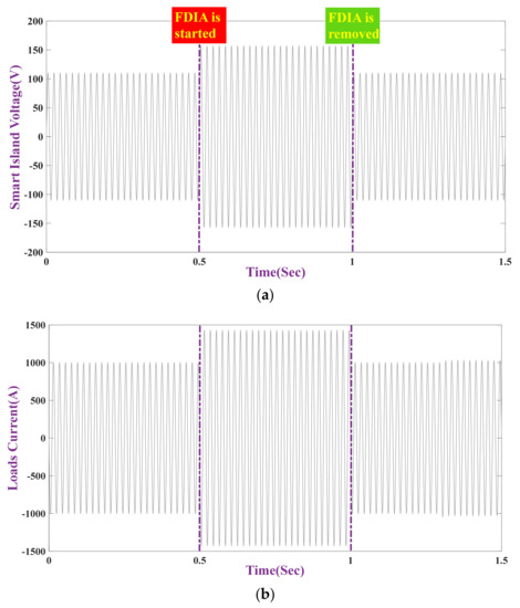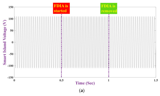 At t = 0.5 s, FDI attack began and at t = 1 s, FDI attack eliminated. To simulate the cyber-attack, the measured voltage of the ISMG, which is measured by sensor, changed in sensor by the cyber-attack, and the amount of voltage is shown less/more of the real value. The simulation outcomes of the mentioned state are explicated in Figure 9.