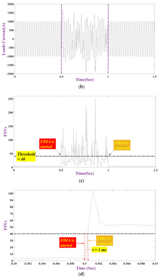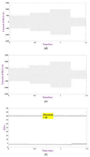 As exposed in Figure 12b, at t = 0.4 s, a resistance load is coupled to the system, and at t = 0.8 s, an inductive load connects, and at s, a nonlinear load is coupled, and the other loads are disconnected. Figure 12a shows the output voltage of the ISMG. Figure 12c–e are depicted as the , and current, respectively. Figure 12f depicted the FSVs of signal in the proposed expression. By choosing a threshold as 40 for cyber-attack diagnosing, it can be seen that the presented scheme is capable to successfully notice FDIA from loads changing.