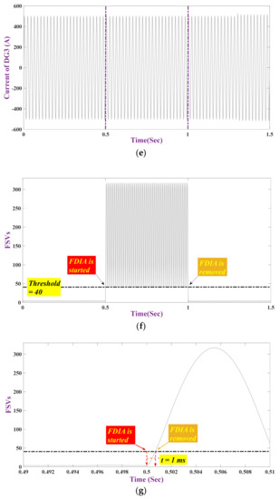 Manipulating shared current between unit II and III. In this case, the efficiency of the FSVs in FDIA detection is considered via injecting malicious data on current waveform that is measured by smart sensor (manipulating shared current between agent II and III). At t = 0.5 s, FDI attack began and at t = 1 s, FDI attack eliminated. To simulate the attack, the measured current of the ISMG, which is measured by sensor, changed in sensor by the cyber-attack, and amount of current is shown less/more of the real value. The simulation results are represented in Figure 11. In this case, Figure 11a displays the ISMG output voltage. Loads current is exposed in Figure 11b. Figure 11c–e display the , and current, respectively; it can be seen that the generation current of increased during the attack but the load is firm and produced current against the attacked current to omit more current that generated via . Figure 11f shows FSVs of waveform in the proposed expression and via choosing a threshold as 40, it is able to observe that the declared mechanism is able to successfully detect the attack. Response time of the expressed scheme at the time of FDI attack is represented in Figure 11g. As shown, the speed of the presented scheme is allowable and can detect the attack less than 10 ms from the time which the FDIA has occurred.