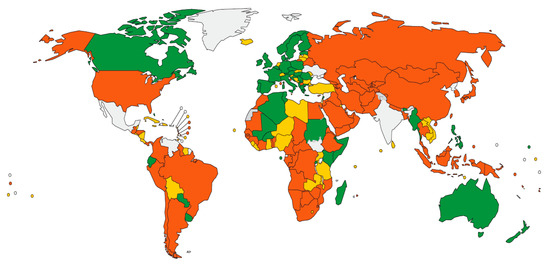 The WHO (2013, 2015) [8,9] reported that 97 out of 180 countries around the world have urban maximum speed limits equal to or lower than 50 km/h and emphasizes that more countries should introduce 50 km/h as the maximum speed based on its accident reduction effect. In these countries, higher speed limits are applied as an exception to some roads such as urban belt highways. The following Figure 2 shows the classification of the speed limit by country/area.