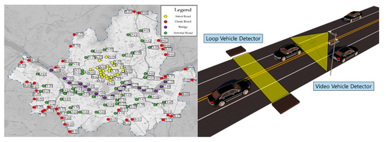 However, the existing research relating to selecting a speed limit has not developed due to the limitations of data collection, and some methods select the speed limit only according to the function of the road. As shown in Figure 3, since detectors are installed only on some roads, it is not possible to collect data on all urban roads. This is a problem not only in Korea, but in all countries.