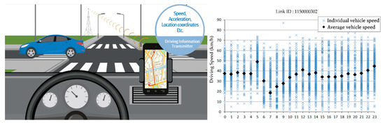 Recently, it has become possible to acquire driving information for each driver (speed, location, route, etc.) using cell phones, and the method of collecting the data has also changed. When application collection data are applied to GIS, they can be applied as traffic volume and speed data, as shown in Figure 4.