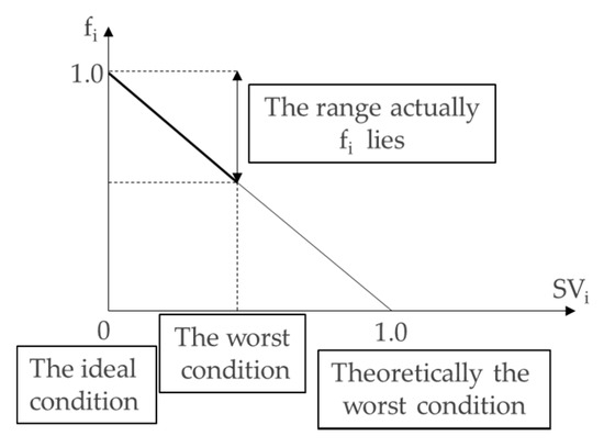 To develop the adjustment factor estimation criteria, it was first assumed that a variable (Vi) and its corresponding adjustment factor (fi) have a linear relationship. Figure 7 shows an abbreviated form of fi between 0 and 1 on the y-axis. In addition, the x-axis variable was standardized to a value between 0 and 1. Then, if the standardized variable is denoted as SVi, the adjustment factor can be obtained as follows: