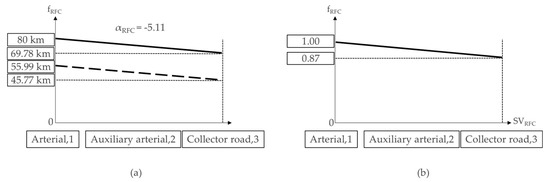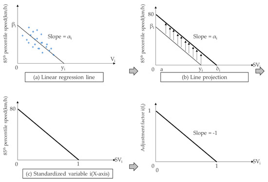 To convert the value of a given variable to a factor value between 0 and 1, the 85th percentile speed and linear estimation function were obtained for each variable (Figure 9). The objective of the function estimation is to determine the statistical significance (i.e., p = 0.05) and obtain a linear relationship.