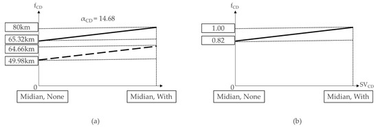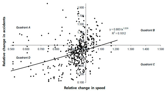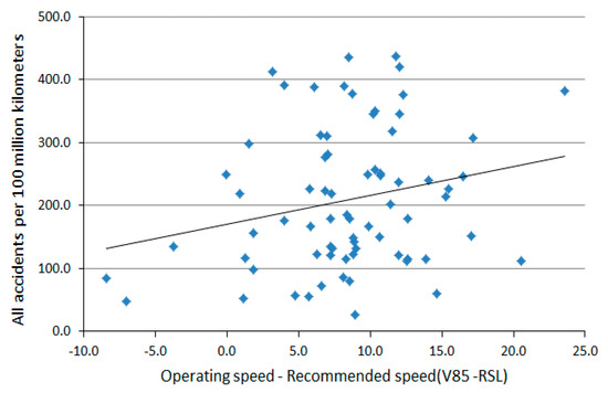 According to Elvik [36], higher driving speeds lead to the accident rate increasing according to the road type. Therefore, assuming that other conditions are maintained, if the speed limit calculated by the estimation equation is lower than the existing speed limit, it is expected that the accident rate would decrease owing to the reduction in the operating speed.