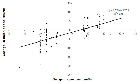 Regarding the relationship between speed limit changes and subsequent mean operating speed changes, speed limit reductions implemented using the power model resulted in a 25% reduction in the mean operating speed [37]. For example, reducing the speed limit by 10 km/h corresponded with the mean speed decreasing by 2.7 km/h (Figure 19).