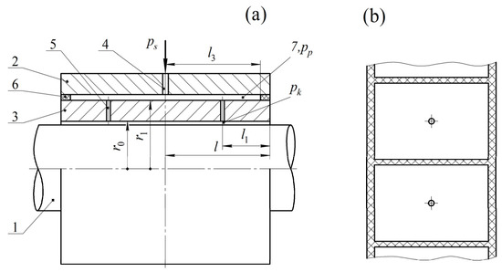 An aerostatic journal bearing (Figure 1a) consists of a shaft 1 (Figure 1), a body 2, and a stationary inner sleeve 3 resting on a rigid annular suspension 6. In the body 3, throttling diaphragms 4 are made, and, in the movable sleeve 3, there are damping annular diaphragms 5, where resistance in a stable bearing should be at approximately an order of magnitude lower than the resistance of the feeders 4. This ensures maximum stability and optimal dynamic quality [18]. The surfaces of the body, bushing, and suspension form inter-throttle chambers 7, where volume plays an essential role in ensuring the optimal dynamic quality of the structure. In order to reduce the negative effect of the circumferential crossflow of air in the inter-throttle cavities on the load characteristics of the bearing, they are separated from each other by a sufficient number of longitudinal baffles, as shown in Figure 1b.