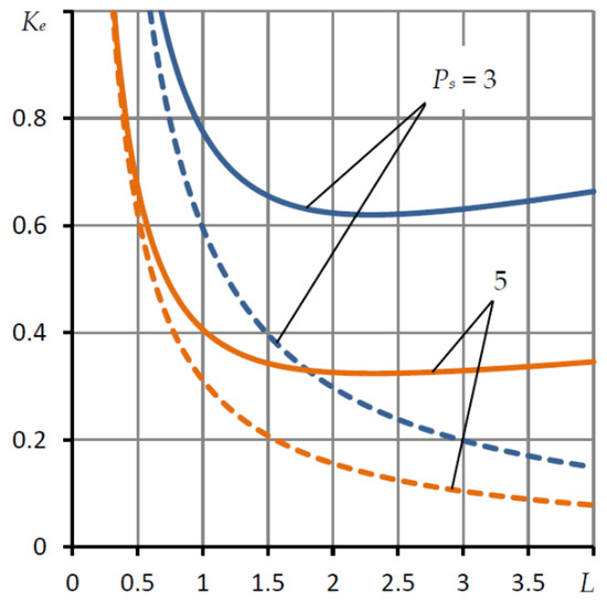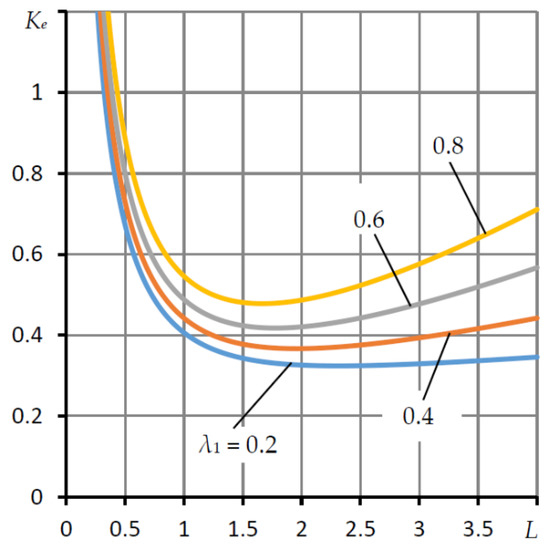Figure 2 shows the dependences of the compliance Ke on the length L at various values of the relative elongation of the end length λ1 = L1/L, the injection pressure Ps = 5, and the recommended values of the SECT tuning factors χ = 0.45, ς = 0.15 [18,21].