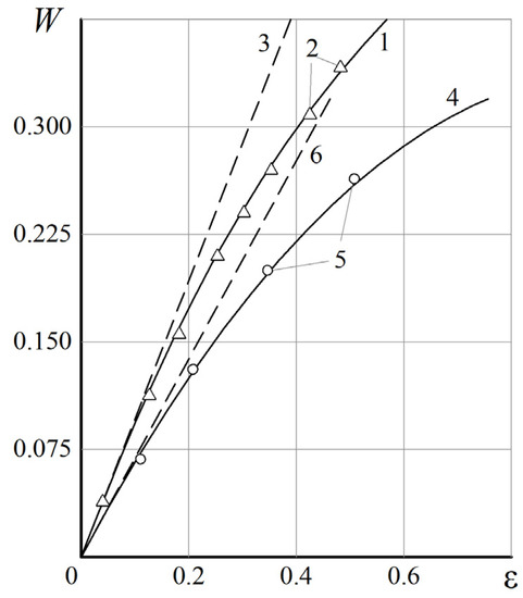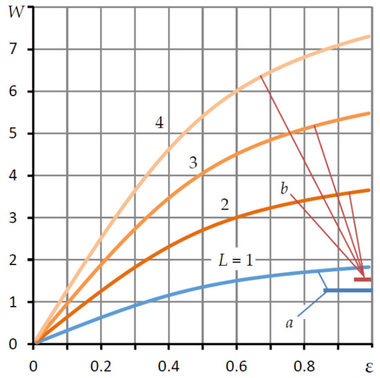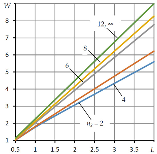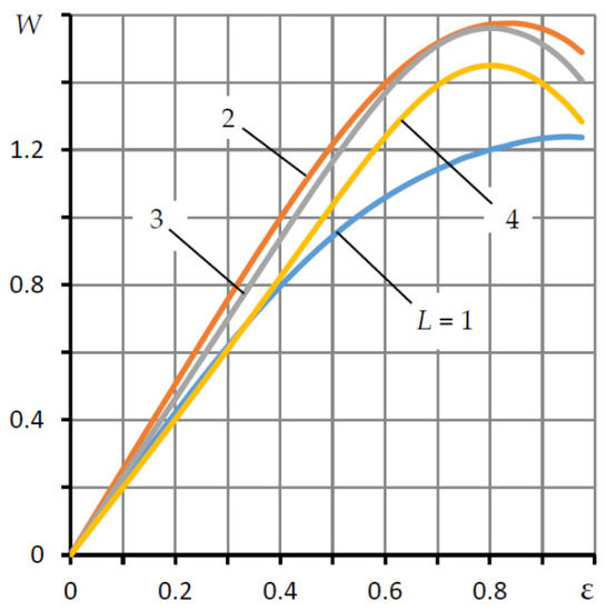 Figure 9 shows the graphs of the dependences of the bearing capacity W on the eccentricity ε calculated by Formula (71) for various values of the length L for Ps = 5, λ1 = 0.2, χ = 0.45, ς = 0.15, and ng ≥ 12. The graphs are similar to Figure 2.