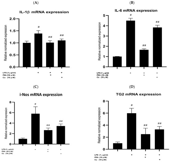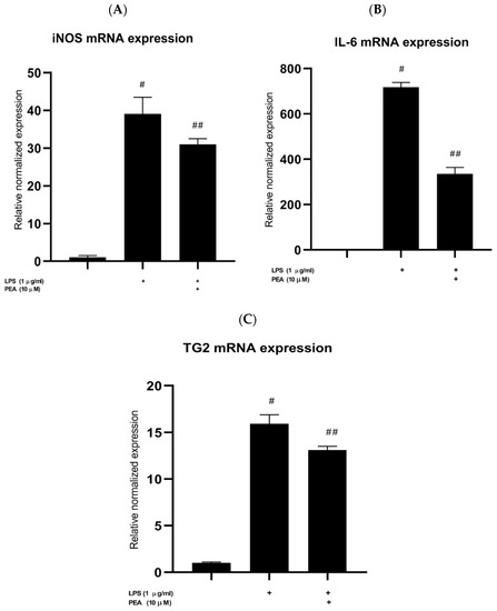 Real Time-PCR was performed to measure the mRNA expression. Murine primary microglial cells were treated with the indicated concentrations of PEA followed by treatment with 1 μg/mL LPS for 24 h. Data are shown as the mean ± SD of three independent experiments. # p value < 0.05 compared with control group. ## p < 0.05 compared with LPS group.