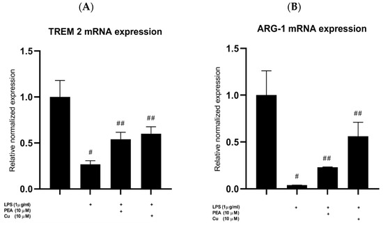 Neuroinflammation has an important role in the progression of many neurodegenerative diseases. In this study, we initially focused the attention on the anti-inflammatory effects of PEA and curcumin, nutraceuticals tested under in vitro neuroinflammatory conditions induced by challenge with LPS. To study the anti-inflammatory effects on a BV2 cell model, this cell type was treated with LPS 1 μg/mL in the presence or absence of the nutraceuticals tested at a concentration of 10 μM for PEA and curcumin. The exacerbated activation of microglia, however, induces neuronal death, a histological characteristic of neurodegenerative diseases such as PD and AD [30,31]. In order to confirm the pharmacological effects of the two neuronutraceuticals under investigation in our study (Cu and PEA), we firstly evaluated the RNA expression levels of some already known pro-inflammatory or anti-inflammatory markers, together with the RNA expression levels of TG2. We found that the molecules tested reduced the pro-inflammatory markers Interleukin 1β (IL-1β) and Interleukin 6 (IL-6), and inducible Nitric oxide synthase (iNOS) mRNA levels were increased by the LPS presence (Figure 1A–C); conversely, they increased the RNA level synthesis of the neuroprotective or anti-inflammatory markers’ triggering receptor expressed on myeloid cells 2 (TREM-2) and Arginase-1 (ARG-1) (Figure 2A,B) in LPS-stimulated BV2 cells. Intriguingly, we noted that TG2 expression shows a similar profile of pro-inflammatory markers. In fact, TG2 RNA levels increased under LPS-derived pro-inflammatory stimulus, and they decreased when the tested nutraceuticals were added (Figure 1D).