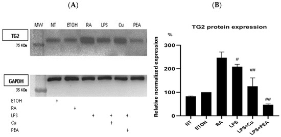 Panel (A): Western blot for TG2 protein expression. BV2 cells were cultured in medium supplemented or not (NT) with 10 μM of PEA and Cu or in presence of 1 μg/mL LPS for 48 h. Cells were treated also with 10 μL of ethanol (ETOH) as a negative control or with 10 μM retinoic acid (RA) as a positive control. SDS-PAGE was blotted with an antibody against TG2. GAPDH protein expression was used as loading control. The experiments were performed at least 3 different times and the results were always similar; Panel (B): graph shows the densitometric intensity of TG2/GAPDH bands ratio. # p value < 0.05 compared with control group (NT). ## p < 0.05 compared with LPS group.