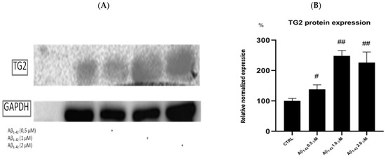 Panel (A): Western blot for TG2 expression in BV2 cells after treatment with different concentrations of Aβ1-42 for 48 h. SDS-PAGE blotted with antibody against TG2. GAPDH protein expression was used as loading control. The experiments were performed at least 3 different times and the results were always similar; Panel (B): graph shows the densitometric intensity of TG2/GAPDH bands ratio. The intensity of signals is expressed as a percentage in respect to the control (CTRL). # p value < 0.05; ## p value < 0.01.