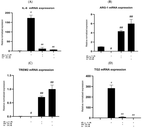 Real Time-PCR was performed to measure the RNA expression levels of TG2 (D), inflammatory (A) or neuroprotective (B,C) markers after 24 h treatment. BV2 cells were pre-treated with the indicated concentrations of PEA or curcumin (Cu), followed by treatment with Aβ1-42 (1 μM for 24 h). Data are shown as the mean ± SD of three independent experiments. # p value < 0.05 compared with control group. ## p < 0.05 compared with Aβ1-42 group.