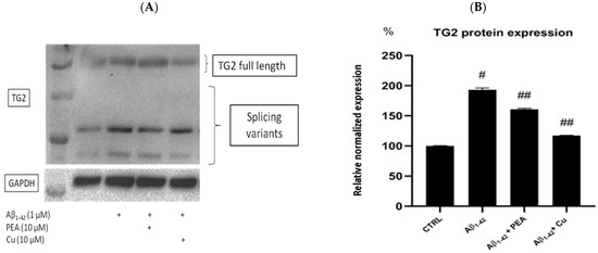 Panel (A): Western blot for TG2 expression. BV2 cells were cultured in medium supplemented or not with 10 μM of PEA or Cu, and Aβ1-42 (1 μM) for 48 h. SDS-PAGE was blotted with antibody against TG2. GAPDH protein expression was used as loading control. The experiments were performed at least 3 different times and the results were always similar; Panel (B): graph shows the densitometric intensity the full lanes (TG2 full length and splicing variants)/GAPDH bands ratio. # p value < 0.05 compared with control group (NT). ## p < 0.05 compared with Aβ1-42 group.