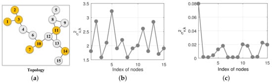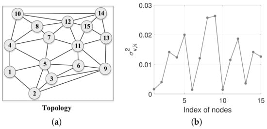 We consider the same topology of the network with nodes as ([12], Figure 5) ([17], Figure 6a), illustrated in Figure 1a. The measurement noise is real Gaussian white noise with its variance at each node k presented in Figure 1b. According to the mean convergence condition, we set the step size to for each node k. We herein consider . Each regressor at each node k is real Gaussian white noise sequence with their covariance matrices with for all k. The noise power of node at the 1500th iteration suddenly goes up to 5.