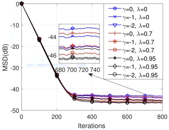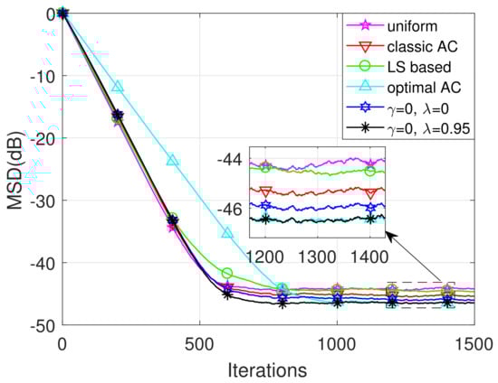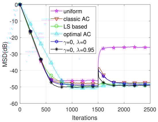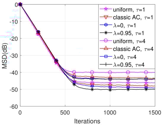 We evaluate herein the MSD of the proposed algorithm. Without loss of generality, the unknown weight vector is set to be with . The initial weight vector estimations are for each node k. The constant used in (22) is set to be and the forgetting factor or . We consider in terms of the proposed AC, where can be 0, −1 or −2.
