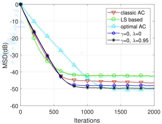 It can be seen from Figure 5 that with specific , the larger brings the higher performance gain for the proposed AC. We could also observe that choosing brings better steady-state performance than the other two choices, especially for small forgetting factor . In particular, as compared to Example 1, for the two scenarios and , we find that larger step sizes in this example lead to accelerated convergence rate at the cost of degraded steady-state performance.