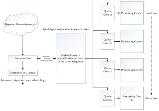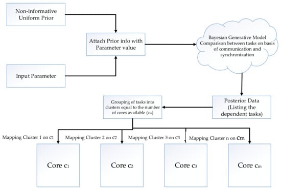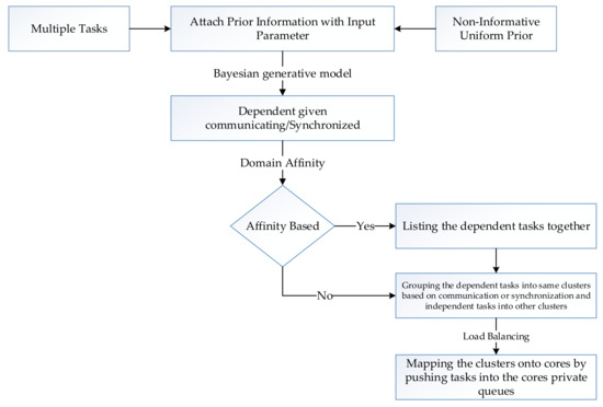 All incoming tasks contain prior information which is then forwarded to a generative model as input; the information contained in each task is analyzed by the Bayesian model and the similarities between tasks are identified as either the tasks are communicating or synchronized. The generative model produces the posterior data as an output which is affinity-based. The tasks which tend to be similar, given the communication or synchronization between them are grouped together to form a single cluster. The total number of clusters made by the Bayesian data model equals the number of cores present in a heterogeneous multicore system.