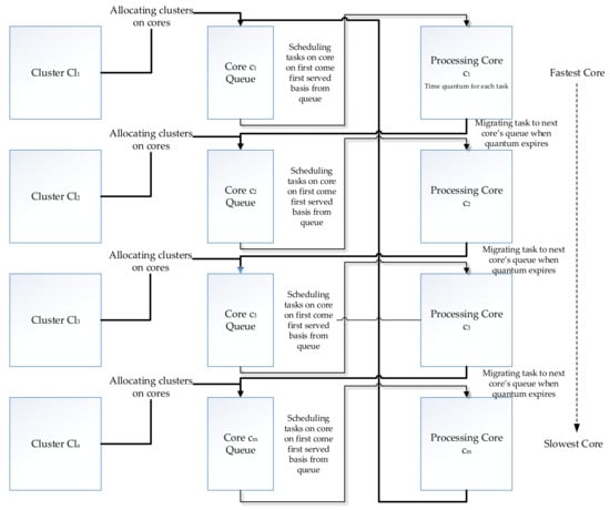 Several affinity techniques on a number of realistic applications are presented in [35]. Jia et al. [36] presented a task scheduling mechanism where dependent tasks are scheduled concurrently on the same core ensuring memory affinity, while reducing task switching overhead. Regueira et al. [37] presented a technique which enables efficient utilization of NUMA systems by assigning tasks to a set of cores taking into account the communication and synchronization times between tasks. The proposed scheme calculated the communication cost and the synchronization cost between the tasks. Johari et al. [38] performed load balancing and scheduling tasks on cores by maintaining a queue (sequential search, random search, random search with spatial locality, average method) and without maintaining the queue (sequential, random and random search with spatial locality). Muneeswari [39] proposed a technique in which critical and non-critical tasks are classified, where the critical tasks are scheduled, such that re-utilization of the cache is minimized while, for non-critical tasks, round robin scheduling is used. Holmbacka et al. and Gantel et al. [40,41] proposed a task replication mechanism in which tasks are migrated between different cores. When a task is created on one core, a replica of the same task is created on other available cores. This enables a task’s replica to become active on a certain core when a task is migrated to that core. However, existing work does not clearly address the load balancing issue in heterogeneous systems, or, if it intended to do so, the way in which tasks are scheduled onto the cores where the computing power of each core is different is not clearly defined. Although all the cores in a multicore system are given a fairly equal number of jobs to process, still the best potential performance of the system cannot be exploited because some cores perform slowly by comparison with the fastest cores.