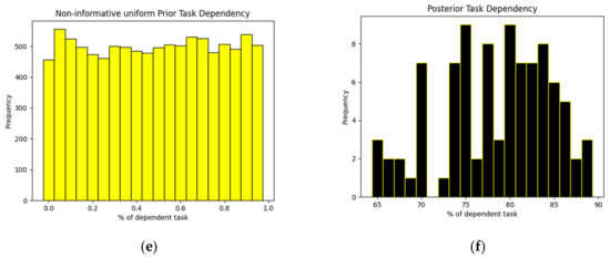 Prior and posterior task dependencies based on different parameter values. (a) Non-informative uniform prior when parameter value is 20; (b) posterior tasks dependency for parameter value 20; (c) non-informative uniform prior when parameter value is 60; (d) posterior tasks dependency for parameter value 60; (e) non-informative uniform prior when parameter value is 80; (f) posterior tasks dependency for parameter value 80.