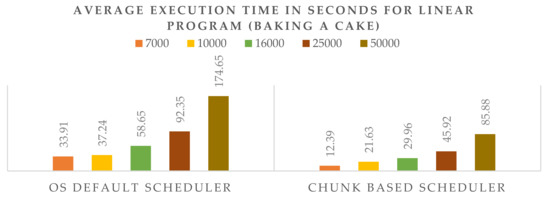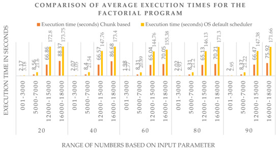 Results show an improvement in the overall average execution time by applying our chunk-based technique compared to the default operating system scheduler. The average execution time for the whole factorial program was reduced by 32–50% compared to the default OS scheduler. The CBS load balancing technique decreases the total execution time of the factorial program compared to the schedulers used by the operating system.