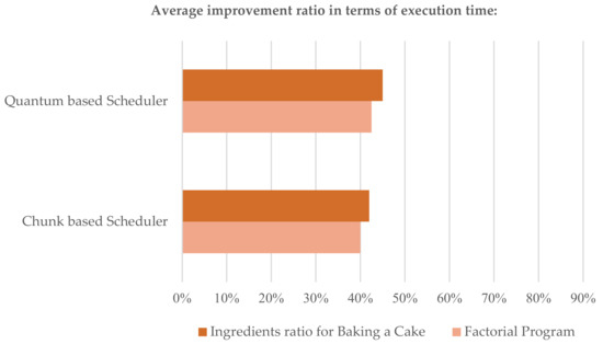 We computed the execution time for different numbers of tasks in a process. Results show an improvement of 44–51% in the overall execution time compared to the traditional operating system scheduler. Figure 8 shows the average improvement rate in the execution time. We applied the chunk-based scheduling and quantum-based scheduling by comparison with the traditional scheduler used by the operating system. The overall execution time of the tasks improved quite significantly.