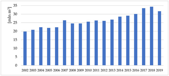 The literature review indicated that Poland’s current forest areas amount to about 9.2 million hectares, which corresponds to about 29.6% of its total territory. The climatic and habitat conditions are conducive to the development of conifers, which account for 69.6% of the total forest area [12]. The most common and most frequently harvested tree species in Polish forests is the Scots pine (Pinus silvestris L.), also called the European red pine [13]. The timber industry’s potential can be expressed by its production capacity. A total of 31,688,773 m3 of coniferous timber was harvested in Poland in 2019 (Figure 1).