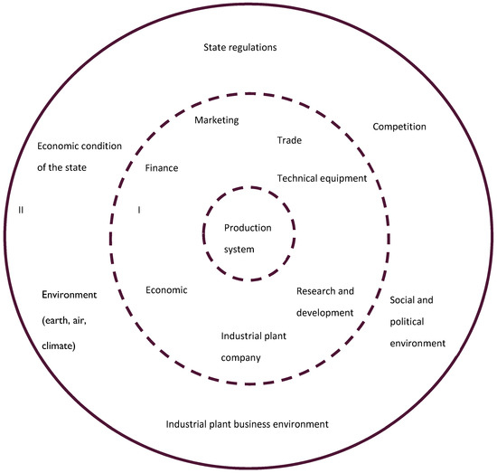 The company environment is strictly dependent on two-stage cooperation. In the first environment (micro-environment), for example, we have to deal with the different types of companies and businesses. In second environment (macro-environment), the country’s economy must be considered, i.e., the economically autonomous region. The environment of the production system affects the functioning of the system, just as the production system affects the nature of this environment. The two-stage company environment is presented in Figure 2.