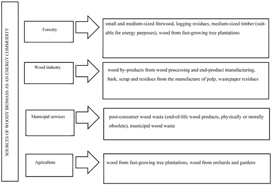 Woody biomass is an important renewable energy commodity obtained by natural processes. Energy from other renewable sources is also increasingly often used in Poland, e.g., solar radiation, wind power, geothermal, aerothermal and hydrothermal energy, non-woody biomass, etc., based on the location, terrain and climatic conditions. Woody biomass is classified as solid biomass, and along with biogas and bioliquids, belongs to the general category of biomass. Generating energy using biomass is deemed to be low capital-intensive and is considered the fastest way for Poland to meet its international commitments for the production of heat and electricity using renewable sources. Biomass production is essentially spontaneous and occurs through the reaction of solar radiation and photosynthesis, resulting in 470 kJ of chemical energy being accumulated in carbohydrates synthesized from one mole of CO2 [57]. The advantage of wood as an energy commodity lies in its specific technical and functional properties; therefore, tree biomass is predominant among energy commodities classified as solid biomass. Firstly, this is due to its relatively high calorific value and low emissions (generating the same amount of CO2 in the combustion process as that which was absorbed during vegetation). Secondly, it is thanks to its relatively low content of non-flammable minerals and trace content of sulfur compounds, as well as the high melting point of the ash produced by combustion. As stated before, the very nature of wood results in woody biomass for energy purposes being obtained primarily from the forestry and wood sectors (including the timber industry and its auxiliaries, the pulp and paper industry and the furniture industry). Agriculture is yet another source of such biomass. The literature [51,58,59] indicates that woody biomass of various types, i.e., roundwood, wood by-products (forestry and wood processing waste), as well as post-consumer wood waste, may be used as an energy commodity. It may vary in form and size. Firstly, it can be in unprocessed (e.g., rolls, billets, edgings), shredded (e.g., chips, sawdust, bark), processed (logs) or compacted (pellets, briquettes) forms. However, it must be pointed out that woody biomass for energy purposes may significantly differ in regard to its density, moisture content, calorific value, chemical composition and impurity content (mineral, chemical, etc.), depending on its form, type, degree of processing and place of generation, even though the chemical composition of woody biomass does not present high variations.