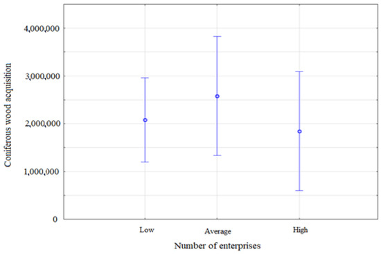 The results of the analysis (using the ANOVA method) made it possible to determine how coniferous timber harvesting, sales of renewable fuel in the form of briquettes to selected customers, and the number of regular enterprise customers affect the number of wood processing enterprises. The analysis showed no impact of coniferous timber harvesting on the number of enterprises. The significance level was greater than 0.05, with p = 0.659. The empirical value of the statistic was F(2, 13) = 0.43139. Figure 4 shows the relationship between the number of enterprises and conifer timber harvesting.