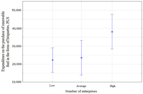 This was different in the case sales of renewable fuel briquettes to selected customers affecting the number of enterprises. Level of significance: p = 0.034, where the empirical value of the F(2, 13) statistic was 4.4565. Based on the significance level, the analysis showed a partial effect (medium and high) of renewable fuel briquette sales to selected customers on the number of enterprises. The characteristics of the relationship between the number of enterprises and renewable fuel briquettes sales to selected customers are presented in Figure 5.